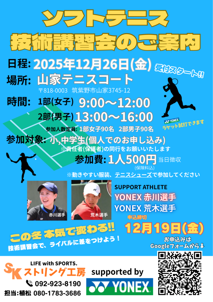 硬式テニス・ソフトテニス・バドミントンの専⾨店として福岡県筑紫野市に店舗をかまえ営業しております。専⾨店に特化した品揃えと熟練したストリング技術で地域密着をモットーにプレイヤーの技術向上のキッカケを⾒つけます!
