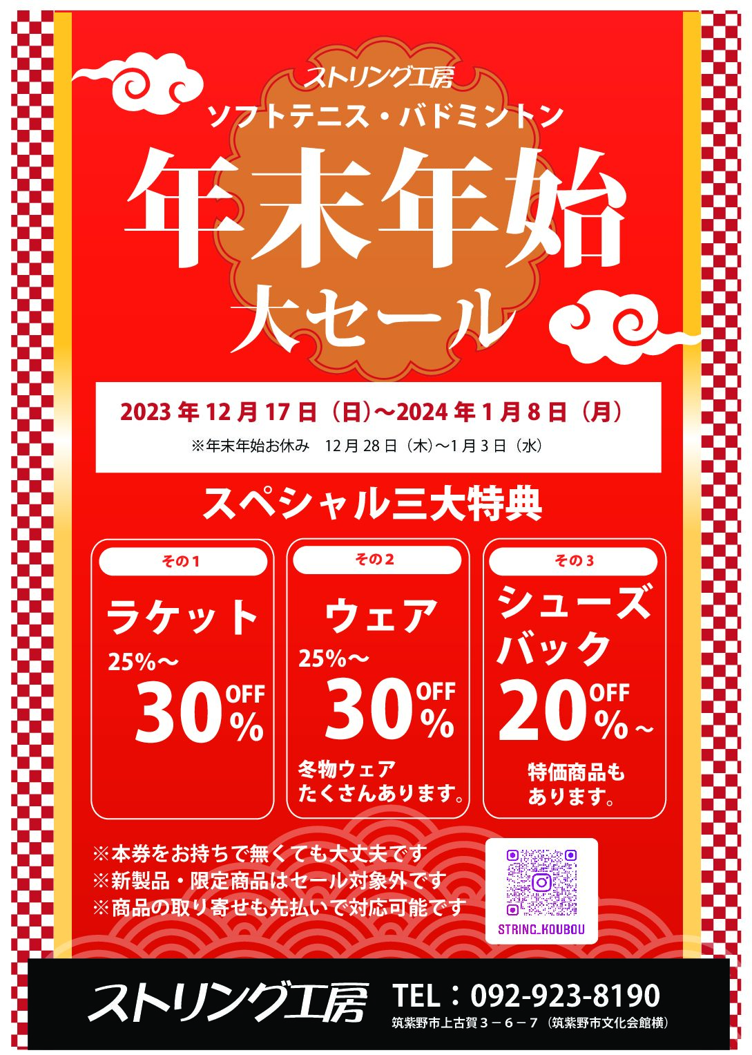 ⭐️ 年末年始セール ⭐️ 2023 12/14 未分類 2023年12月14日 やってきました❗️この時期❗️ 年に一度の"大セール"✨✨ 17日(日)よりスタートします♪ 普段よりお買い得な価格で販売します🙇♂️ ※一部対象外の商品もございます ぜひぜひご来店お待ちしております🔥 未分類 お知らせ ゴーセン セール ソフトテニス テニス バドミントン ミズノ ヨネックス 年末年始 新春福袋 関連記事 ガット張り工賃価格改定のご案内 2026年1月29日 新春おみくじ2026 2025年12月31日 2025-2026年末年始大セール 2025年12月23日 技術講習会のご案内 2025年11月26日 11月3日イベント大抽選会結果発表 2025年11月12日 11/3張替えについてのご案内 2025年10月29日 11月2日、3日営業時間変更のお知らせ 2025年10月25日 11月3日イベント時大抽選会開催! 2025年10月25日